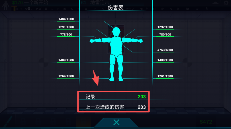 3、在伤害表中,记录下上一次测试造成的具体伤害数值 203。