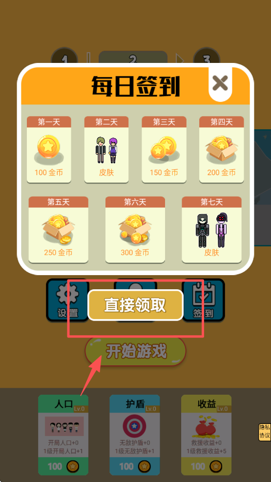 2、每日签到领取奖励,点击“直接领取”获取金币和皮肤。坚持每天签到,奖励更丰厚。