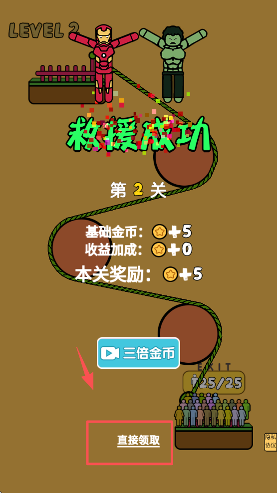 4、关卡成功后,点击“直接领取”获取本关奖励。可以选择三倍金币奖励,增加收益。