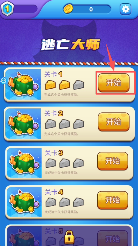 2、在关卡列表中,点击 “关卡 1” 右侧的 “开始” 按钮,进入该关卡的逃亡场景。