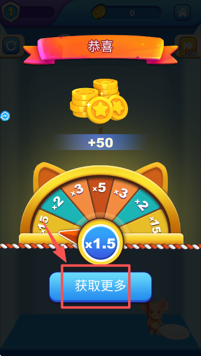 4、通关后在奖励界面点击 “获取更多” 按钮,领取对应的金币奖励及额外加成。