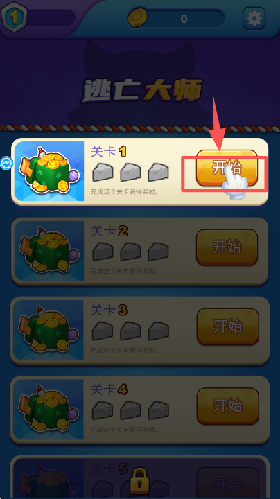 1、在关卡选择界面,点击 “关卡 1” 对应的 “开始” 按钮,进入第一关的逃亡挑战场景。