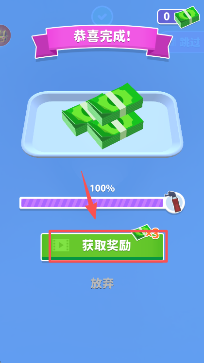 4、在 “恭喜完成” 界面点击 “获取奖励” 按钮,领取本次关卡对应的奖励。