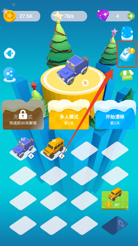 1、进入游戏后就算是挂机不玩,左上角的金币总数也会不断增长,赶快用金币去购买赛车合成高阶赛车吧。