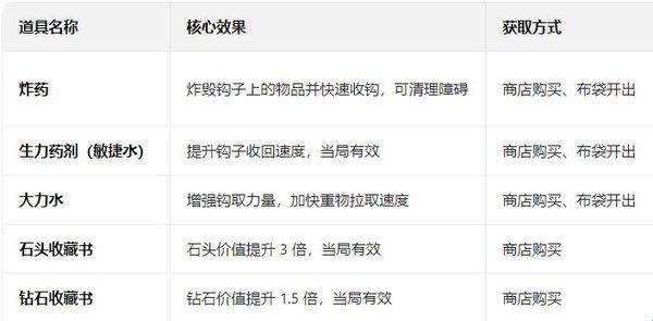 1、游戏拥有炸药、大力水、幸运草、石头收藏书等多种道具,合理使用可提升挖矿效率。