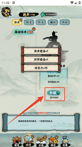 玩家可以进入“功法”,消耗铜钱去提升战意,点击“升级”消耗铜钱就可以升级了。