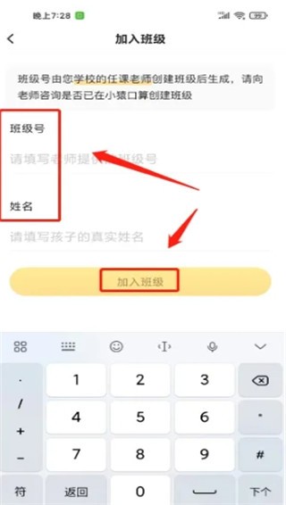 3、输入老师提供的班级号和孩子的姓名后,点击加入班级选项