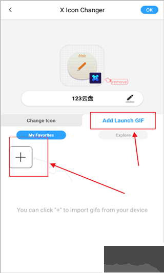 6、点击“add launch gif ”,然后点击加号,新增GIF动图,在新应用图标启动时播放有趣的GIF动画。