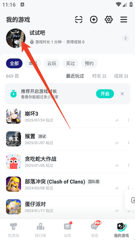 1、打开软件,点击右下角【我的游戏】,然后点击个人头像。