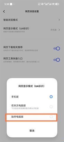 4、选择【始终电脑版】选项就行了,这样就可以调成电脑版模式了。