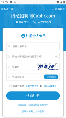 2、然后在该页面输入手机号、验证码,并设置好密码,点击下方的“快速注册”就可以注册个人会员。