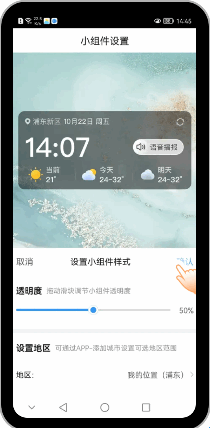 4设置小组件透明度和地区,点击【确认】保存设置