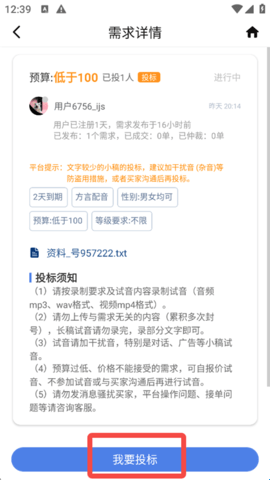 5、查看详细的要求之后就可以点击“我要投标”按钮了。