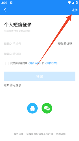 3、继续点击登录页右上角的“注册”。