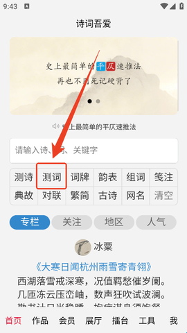 1、进入软件首页后,在首页这里找到“测词”,点击进入。
