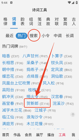 2、然后在里面找到你所作词的词牌,热门词牌这里没有的话就直接去搜索寻找。
