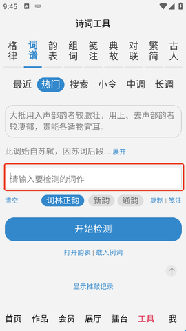 3、找到词牌后点击进入,向下滑,在对话框这里输入你的词作,点击“开始检测”就能得到检测结果。