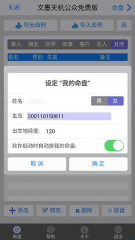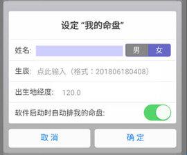 3、输入自己的性别、生辰、出生地经度等排盘信息,设置“我的命盘”。生辰时间是一串12位的数字,其录入结构是:四位“年"、两位“月”、两位“日"、两位“时”、两位“分”,例如2001年6月8日6点08分,录入即200106080608。出生地经度按自己实际的出生地经度填写即可。