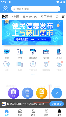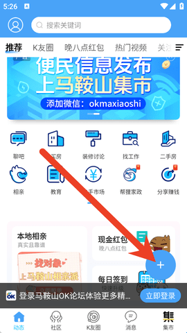 1、进入马鞍山ok论坛找工作首页界面点击右下角的“加号”按钮。