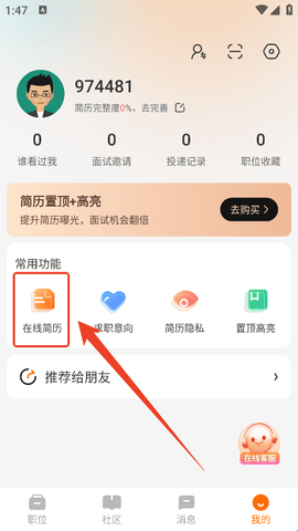 2、然后在“常用功能”中点击【在线简历】。