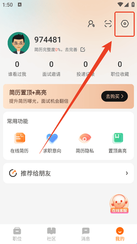 1、在“我的”页面点击右上角的设置按钮。