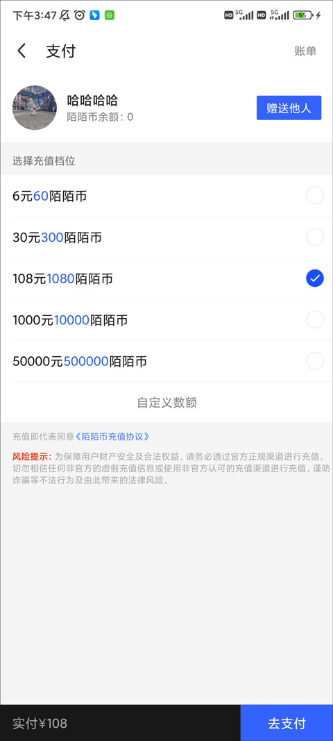 4、在下一步页面中可以看到“赠送他人”的蓝色按钮,点击即可为好友充值陌陌币。
