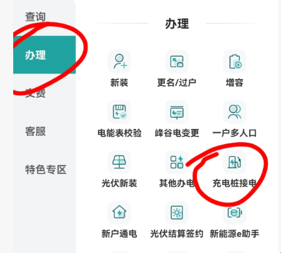 2、打开APP后进行注册登录,在主界面中点击“更多”后找到办理-“充电桩接电”。