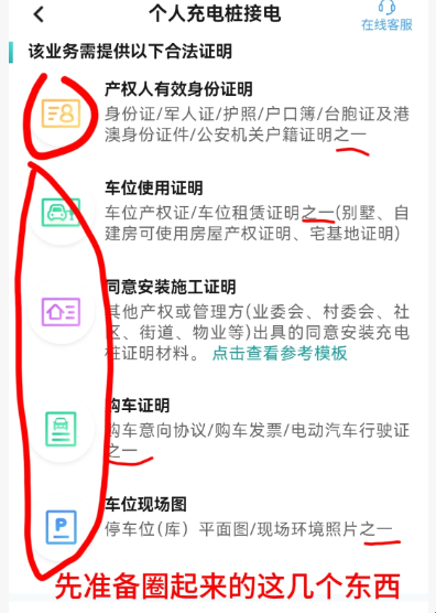 准备以下文件:身份证复印件(正反面),物业授权证明,车位/车库产权证明,购车意向协议/合同/购车发票3者选一即可(以当地国网要求为准)