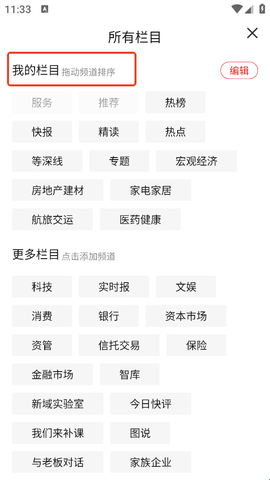 2、然后就来到了栏目管理页面,拖动“我的栏目”里的频道就可以进行排序了,直接将你喜欢的频道拖到前面。