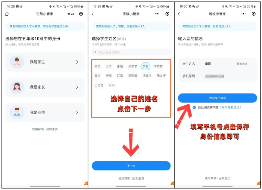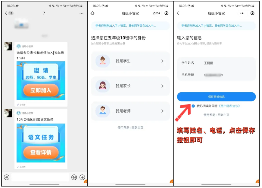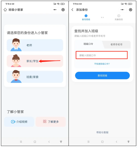 1、微信搜索小程序进入班级小管家,选择身份,输入老师或家委发送的班级口令,或者创建班级老师的手机号码,选择身份、输入信息加入即可。