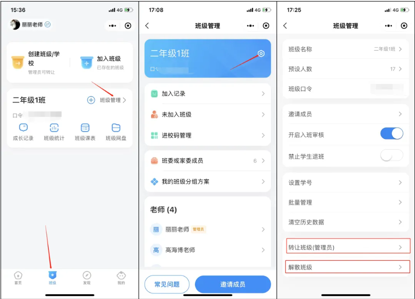 (注:只有班级管理员可以有权限解散班级或者转让班级)