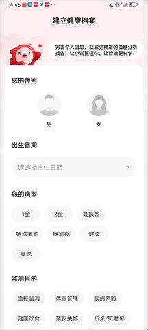 1、打开APP后,登录并填写个人健康信息,帮助APP精准分析您的血糖情况。