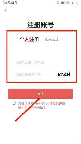 在【注册账号】界面,选择【个人注册】或【法人注册】,根据需求完成注册。