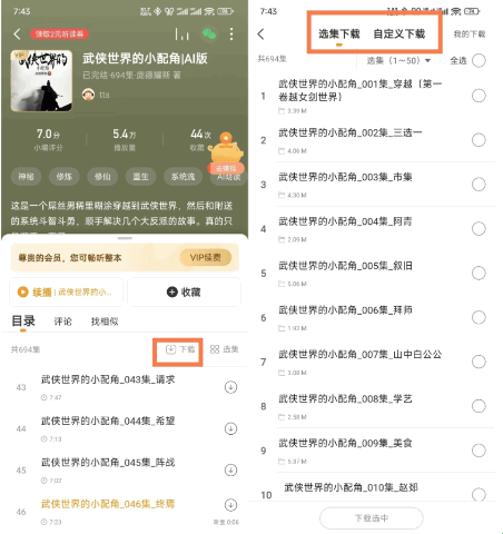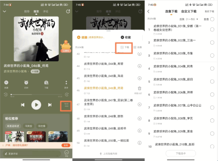 目前版本支持批量下载功能,您可以在资源详情页或者资源播放器页点击下载按钮,进入选集下载界面,您也可以切换至自定义下载界面自行选择批量章节进行下载。下载后的资源可以到我的页界面的下载tab中查看。