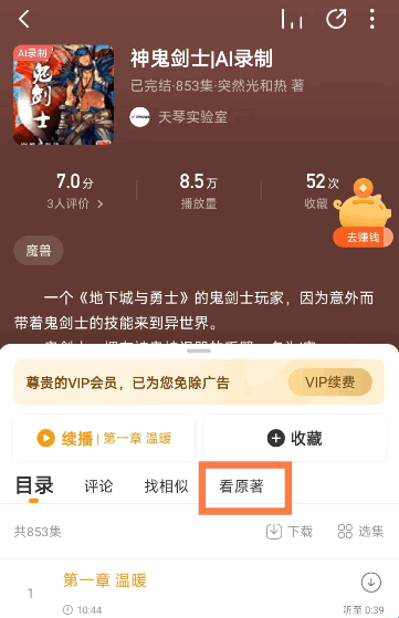目前部分资源支持看原著的功能,进入资源详情页找到看原菩入口,点击即可进入该资源的小说章节;进入资源播放器页在播放界面找到展开按钮,点击展开后再点击原著即可进入小说章节。如果找不到原著入口说明该资源不支持看原著功能。