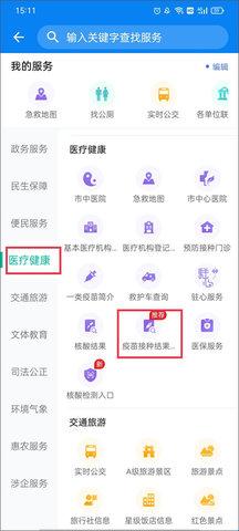 2、然后在左侧服务栏找到“医疗健康”服务,点击【疫苗接种结果查询】。