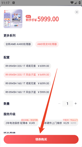 4、选择你要的系列和配置,再次点击“领劵购买”,去完成付款就行了。