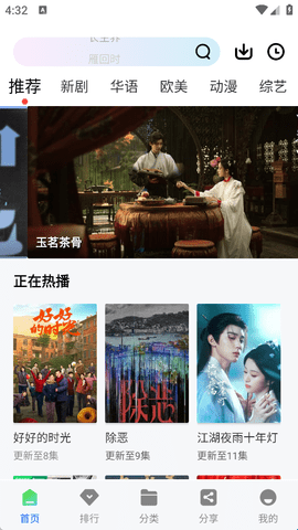 1、拾光影视首页界面是最近先播出的影视内容,用户可以看到最近热门、最新内容。