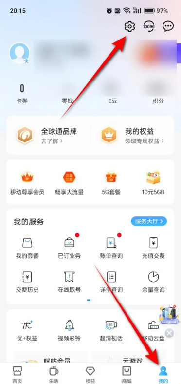 1、打开中国移动“我的”页面,点击小齿轮图标进入。