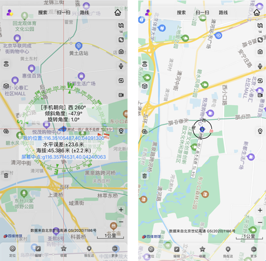再次点击,则显示当前位置的各项数据,三击则显示指南针标识。