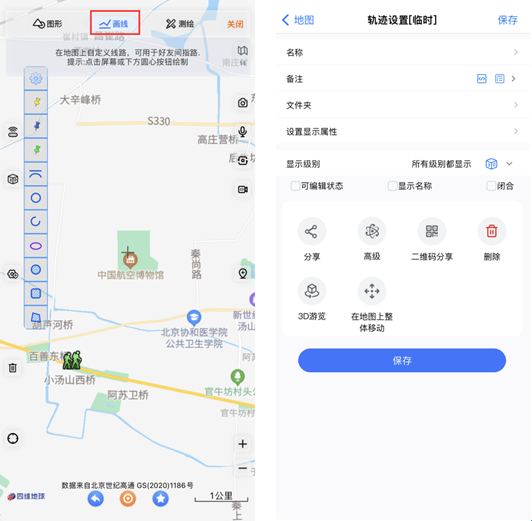 记录轨迹:打开“后台定位”,选择“开始记录轨迹”,即可记录行动轨迹,结束时选择“停止记录轨迹并保存”,同时关闭“后台定位”(否则耗电大)