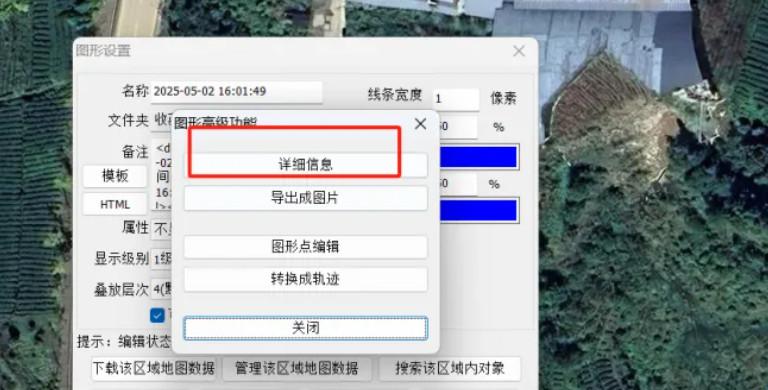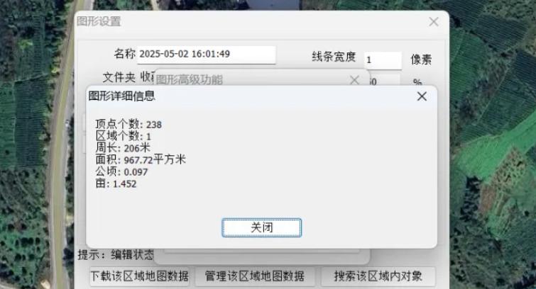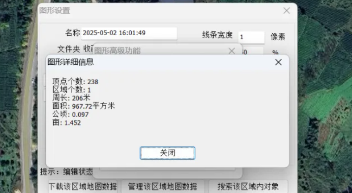 7、点击高级后就会跳出图形高级功能,我们点击查看详细信息,他就会显示顶点个数、区域个数、周长、面积、亩等相关信息