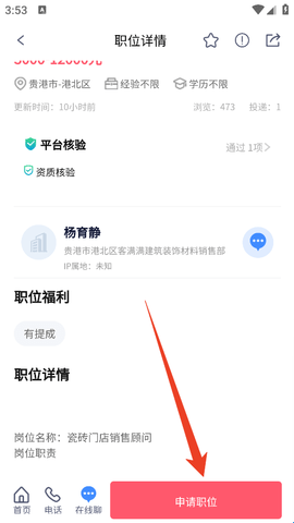 3、找到自己心仪的工作后点击进入,大家在里面就可以申请职位,并投简历了。