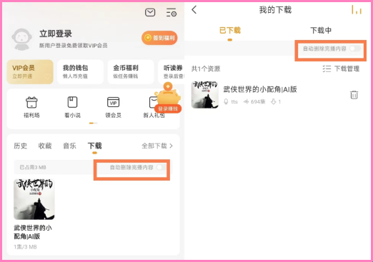 如果想自动删除下载后听过的资源,可以在我的页-下载tab或者点击全部下载入口打开自动删除完播内容开关。