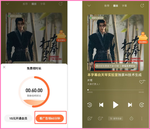 受邀用户,除开通会员的常规付费行为外,还可以通过观看视频广告,获得一定时间内的畅听权益。同时,在您使用时长收听免费内容的过程中,平台将免除大部分广告,为您提供全程无打扰的流畅收听体验。