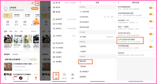 安卓用户请登录懒人听书APP,点击【我的-右上角-设置-应用设置】找到播放设置,进入播放设置可以打开允许与其他应用同时播放的开关,打开后音频将不会自动暂停,您可以根据个人需要选择开启或关闭该功能。