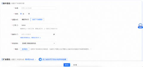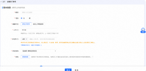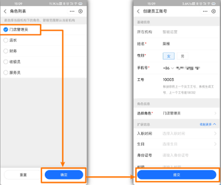 如不想为员工绑定手机号,输入【姓名】【性别】,选择【设定工号短密码】,输入短密码,点击【选择角色】