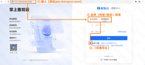 1、请先登录【客如云商家后台】→使用【账号密码/短信验证码】登录(后台网址:pos.keruyun.com)