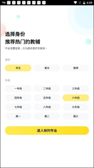 2、之后选择你当前的身份(学生,家长,教师),年级,进入快对作业