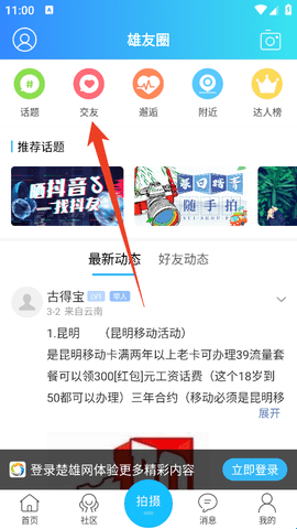 2、然后继续点击上方导航栏这里的“交友”。